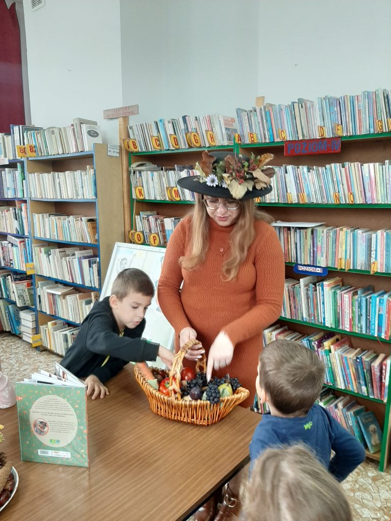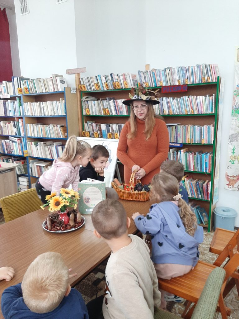 We wtorek 7 października 2025 roku bibliotekę w Piątkowej odwiedziły przedszkolaki. Zastanawialiśmy się co ze sobą niesie jesień. Pomysłów było multum. Dzieci wymieniły deszczową aurę, kolorowe liście, wspólne spacery, grzybobranie, kasztany. Przedszkolaki rozpoznawały dary jesieni wśród których ukryły się warzywa i owoce.