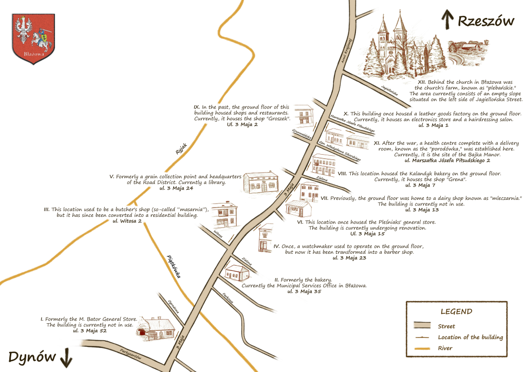 The first part of the walk starts at the former general store located at 52 3 Maja Street and concludes at the Błażowa church.