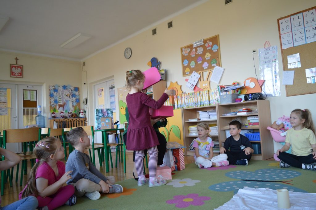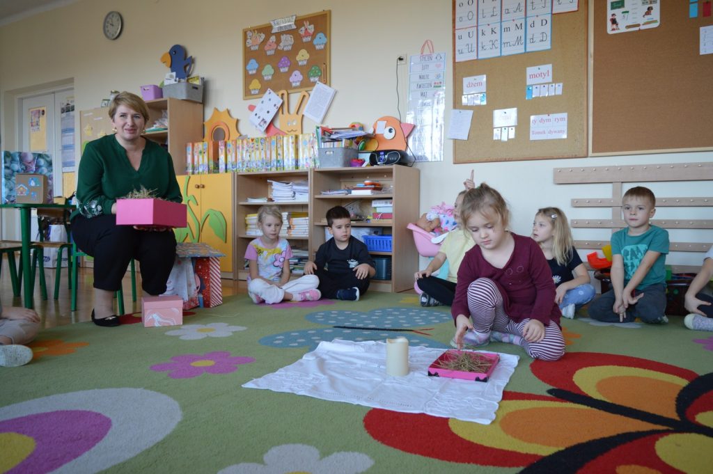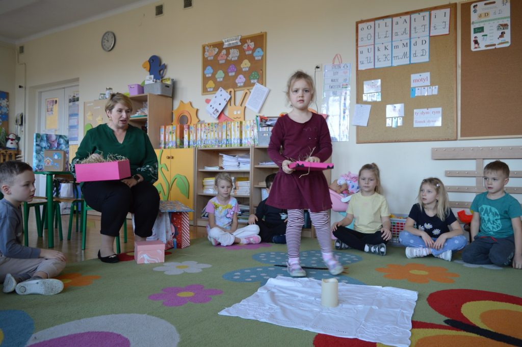 16 grudnia odwiedziłam dwie najstarsze grupy w Przedszkolu Publicznym w Błażowej. Święta tuż, tuż więc i nasze spotkania były im poświęcone, a dokładniej rozmawialiśmy o tradycjach wigilijnych. Pomocna okazała się historia z książki Andrzeja Sochackiego pt. „Wigilia”. Jednym z elementów, które kojarzą się nam ze świętami są, oczekiwane przez wszystkich, prezenty. Nie zabrakło ich i dzisiaj, przyniosłam ze sobą większe i mniejsze torby i pudełka. Jednak zamiast klocków, lalek i słodyczy dzieci znalazły w nich biały obrus, sianko, opłatek, świece, pusty talerz czy śpiewnik z kolędami. Wspólnie rozmawialiśmy o ich znaczeniu, bo to nie zabawki i słodycze są najważniejsze w święta ale Bóg, który się rodzi, rodzina i czas spędzony razem. Po części teoretycznej przyszła kolej na praktykę Świetliki i Zajączki pokolorowały piękne choinki, które połączone stworzyły jedno, wielkie świąteczne drzewko. Kolejne, ostatnie zadanie polegało na przygotowaniu stołu do wigilijnej wieczerzy. Dzieci wykazały się dużą wiedzą i zaangażowaniem.