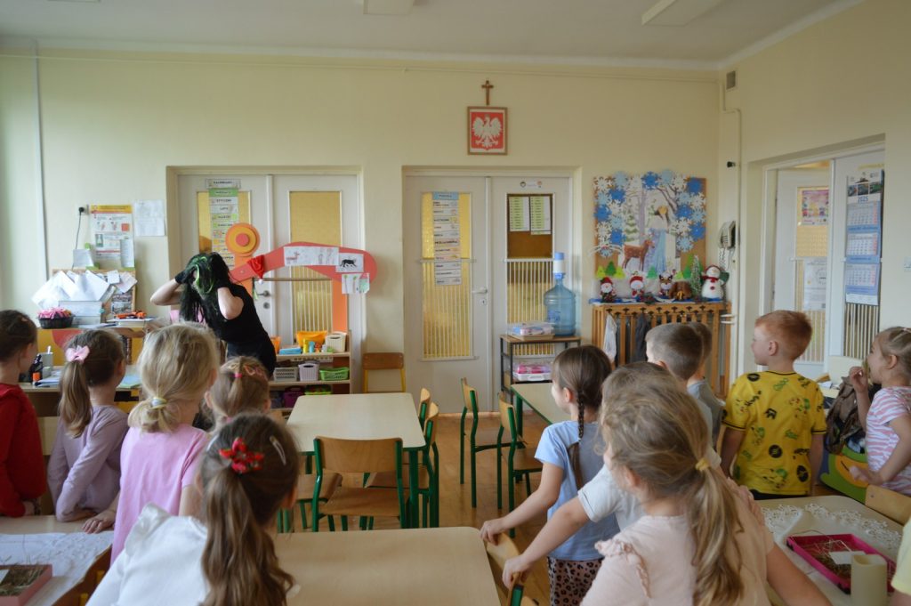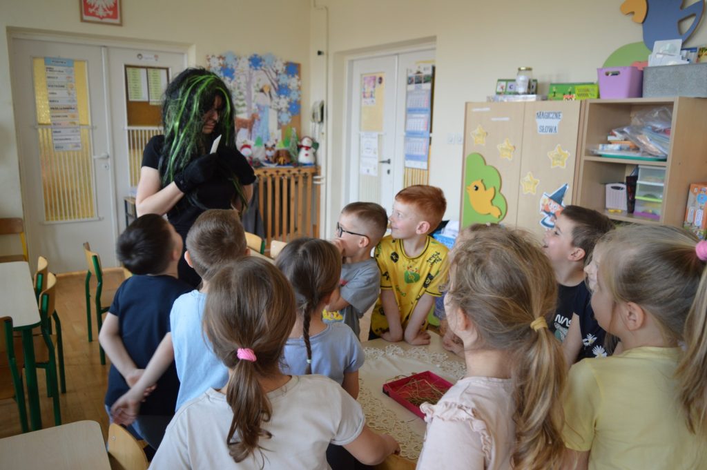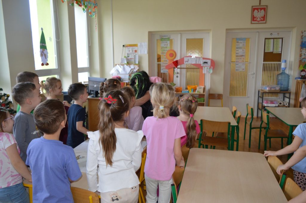Na zakończenie mojej wizyty w grupie „Zajączków” pojawił się niespodziewany gość, który narobił niebywałego zamieszania. Murzynek Bambo nie miał pojęcia co to jest wigilia, co robi się z opłatkiem i po co na stole kładzie się sianko. Na szczęście nasi mali eksperci wszystko mu wytłumaczyli a na pożegnanie zaśpiewali mu kolędę.